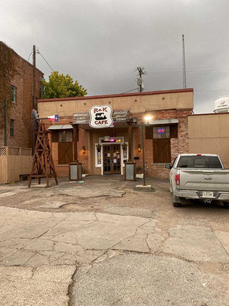 After a brief stroll around the square, I decided to grab some breakfast. Having never been to this part of Hillsboro, I relied on Google to guide me to the most revered place to eat and it pointed me to the R & K Cafe, just north of the main square. I hopped out of my truck and, as a reminder of the recent lunacy, the wind stirred up a nice batch of chicken feathers as they flew out of my truck and floated in the surrounding air. There was a group of State Troopers walking out into the parking lot as this happened and they all had the same “double-take and head cocked to the side in confusion” look as they witnessed this not-so-proud moment. I nodded as I walked past them, praying that they didn’t get hit with the aromatic hints of what lied within the stains on my clothes. Anyways, back to the cafe.