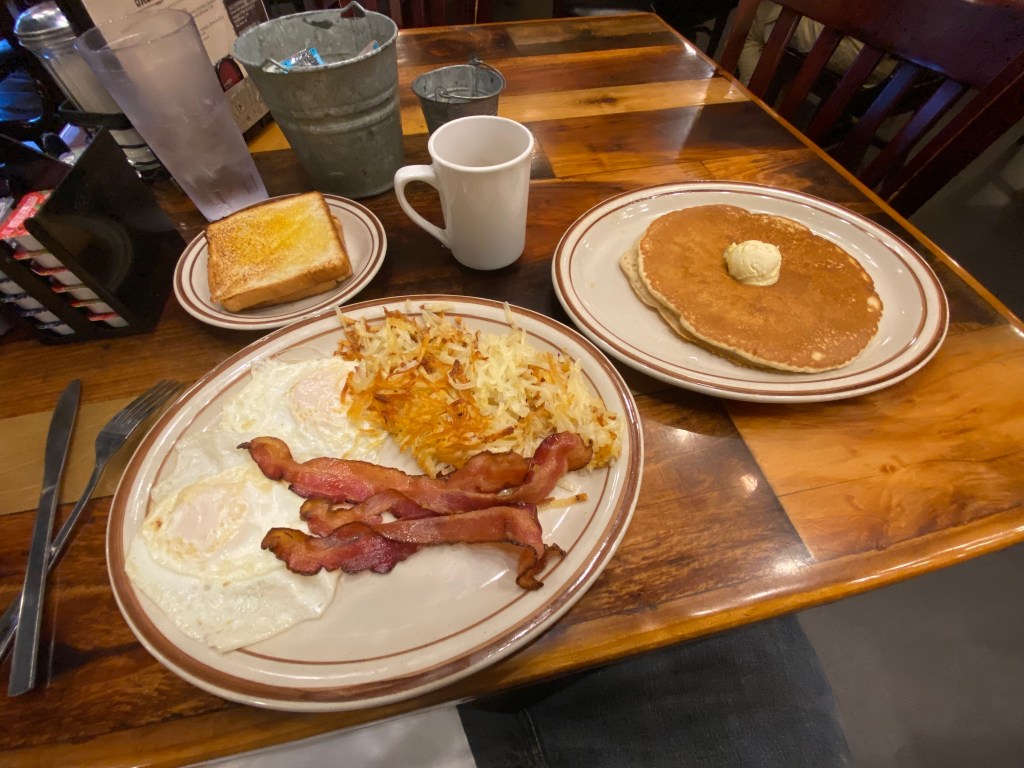 I ordered a coffee and a water, and went with my usual breakfast order… Two eggs over easy, with bacon, hash browns and toast, and a single pancake to top it off. As I’ve eaten at many a small town cafe, I’ve found that it’s hard to screw up a good old fashioned, traditional breakfast. I can’t recall a time that I’ve ever been let down and today was no different. That being said, I almost became emotional as I took bite after bite of possibly the most delicious breakfast I have ever had. I even told the waitress that I was certain that they’d brought my great-grandmother back to life and had her back there in the kitchen doing what she loved most… making good food for good people. I don’t know how you can make something as simple as eggs, potatoes, and bacon taste as if you’re trying them for the very first time, but they have somehow figured it out. I am lost for the right words to describe this experience, but I was literally almost brought to tears as this meal took me back to an incredibly special time in my childhood. I took it all in, savoring every bite, and washed it all down with one of the tastiest cups of coffee I’ve ever had. I was one happy individual.