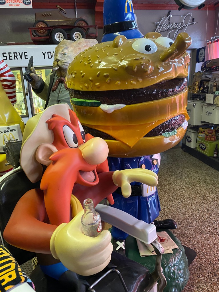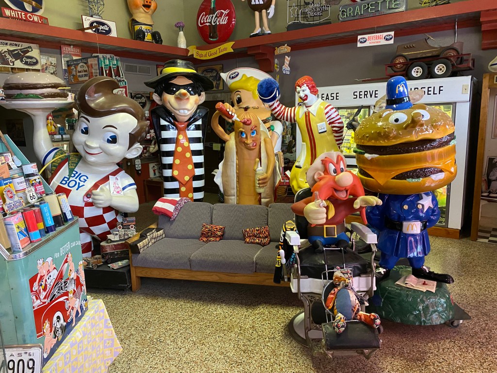 Once inside, the proprietor, Carrol Estes, started flipping light switch after light switch. As the main room slowly lit up, I was amazed at what I saw. This place is home to one of the most impressive collections of 50’s and 60’s memorabilia that I have ever seen or heard of. From statues of the many corporate mascots of yesteryear to countless old signs and toys, it was impressive to say the least. The collections are so vast that you could spend an entire day here and never come close to seeing everything.