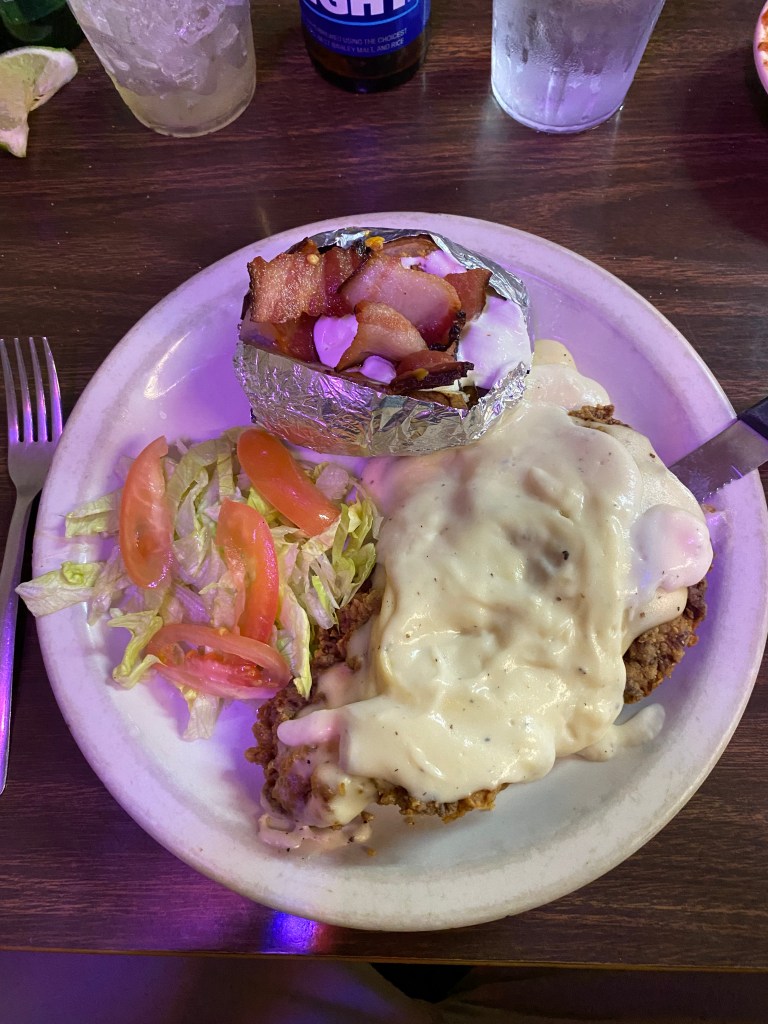 It was another semi late dinner, at least for us it was, and, to be honest, we could have easily skipped dinner but that’s not a very adventurous attitude now, is it? We walked into a fairly busy place, but were seated right away. Our waiter took our drink order, another staff member brought us some chips and salsa, and we began to scan the menu. I noticed something that they had an entire section of the menu dedicated to the many different types of chicken fried steaks that they offer, and my senses heightened a bit. Not only did my stomach start to nudge me in the direction of one of these tempting treats, but so did my heart. My old man and I used to “hunt” for chicken fried steak. Every single time we ate together at a restaurant, we ordered the chicken fried steak. We always ranked them and compared them to others from our past experiences, and our extensive research revealed that it’s pretty hard to mess up a chicken fried steak. Granted, there were a few that would have been better suited as a sole on a boot, but those were rare exceptions. The fond memory of those times with my dad settled it… chicken fried steak it was. The wife went with the trio of enchiladas, and baby girl wanted chicken tenders. We placed our orders and resumed our enjoyment of each other’s company. As I looked around the place, I noticed a sign at the bar that read “No Wifi Here… Talk to Each Other!”. An instant smile came over my face as we rarely have our phones out during dinner. Another scan of the place showed that most of the townspeople there were doing the same… just talking to each other and enjoying the evening together. At this point, it had been about twenty minutes since we ordered, but we weren’t in a hurry so we ordered another round of drinks and went on with our babbling. About 40 minutes later, still no food. Again, we understood that they were busy, so we shrugged it off and carried on with our random conversations. Once we hit an hour, though, I started to get annoyed, but just as I was about to let it get to me, I realized that no one else was getting their food any faster and, even more, no one cared at all. They were enjoying each other’s company and, in the grand scheme of things, were enjoying a slower and simpler way of life than one can become accustomed to living in a big and bustling city. I quickly corrected my feelings, and our food came soon after.