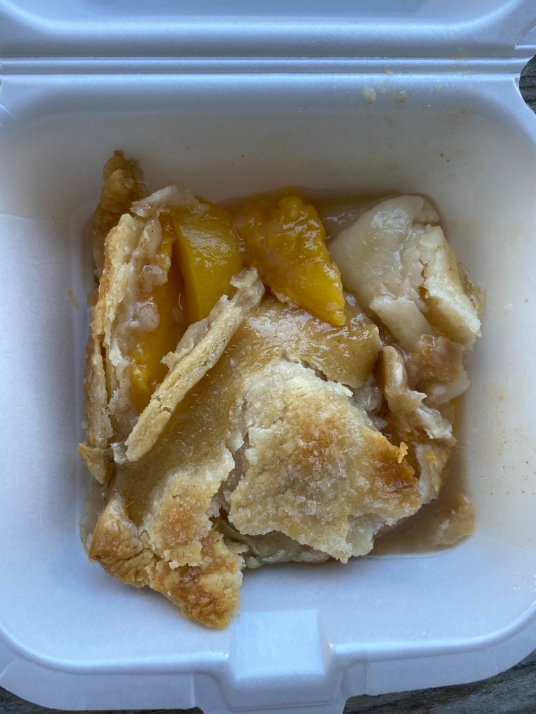 We were greeted by what I assume was one of the owners, a kind lady that didn’t try and rush us to order. We ordered a wide variety of items… Brisket and Ribs for me, a Brisket Sandwich for the wife, some potato and macaroni salad, and there was more than enough to make sure baby girl got her fair share. Each of our meals came with a choice of drink and dessert. For dessert, they offer a brownie or peach cobbler, both made in-house. And before I forget, they make their own bread, too! We decided to try one of each of the dessert choices, took a seat at one of the picnic tables outside, and waited for our food.